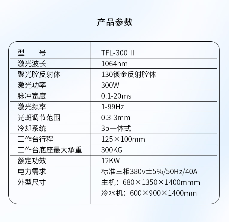 環(huán)境溫度:攝氏4度-攝氏32度。設(shè)備運(yùn)行時(shí),環(huán)境溫度不可以超過(guò)攝氏32度,因?yàn)榧す怆娫床糠郑β屎芨撸恍┕β势骷\(yùn)行時(shí)發(fā)出熱量需要及時(shí)散發(fā)出去,而環(huán)境溫度太高會(huì)導(dǎo)至不能正常散熱,會(huì)引起整個(gè)系統(tǒng)的工作不穩(wěn)定,甚至損壞。而冬天的時(shí)候,需要嚴(yán)防冷卻水結(jié)冰,因?yàn)榧す饩w、氙燈、聚光腔都充滿了水,結(jié)冰會(huì)直接導(dǎo)致這些器件的損壞。冬天時(shí)如長(zhǎng)時(shí)間不運(yùn)行情況下,將腔內(nèi)的水排空;如再開機(jī)前,先重新加水,打開電源空氣開關(guān),先行主機(jī)不開,只開水機(jī)空機(jī)運(yùn)行10分鐘,等水溫回復(fù)到攝氏4 度以上,再開主機(jī)。(強(qiáng)烈要求不能將設(shè)備放于室外或者低溫結(jié)冰的情況下使用,否則極易損壞設(shè)備)