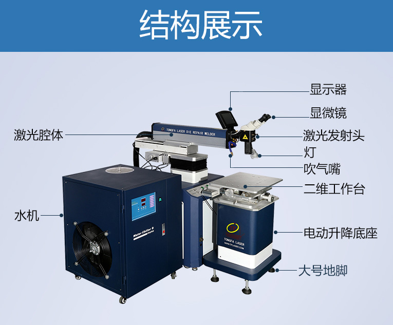 出口型模具激光焊機(jī)是通發(fā)激光公司專門為出口國(guó)外客戶使用而設(shè)計(jì)的系列機(jī)型TFL-200E-D,配置激光頭電動(dòng)升降,同時(shí)配置操縱桿無(wú)極調(diào)速控制XY橫向和縱向電動(dòng)移動(dòng)。適用于各類精密注塑模具、壓鑄模具等模具激光修補(bǔ)焊接;同時(shí)也適合鑄件沙孔激光修補(bǔ)、模具崩缺激光修復(fù)、過(guò)切加工等的激光修補(bǔ);各類金屬結(jié)構(gòu)件、金銀首飾的激光焊接加工。