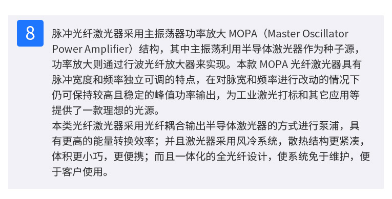 通發(fā)激光TFL-80SW振鏡激光焊接機(jī),采用主振蕩器功率放大 MOPA(Masrer Qscillator Power Amplifier)結(jié)構(gòu),實(shí)現(xiàn)脈沖寬度和頻率獨(dú)立可調(diào)的特點(diǎn),在對脈寬和頻率進(jìn)行改動的情況下仍保持較高且穩(wěn)定的峰值功率輸出,適用于電池、小五金等多個行業(yè)的激光打標(biāo)、激光焊接應(yīng)用。