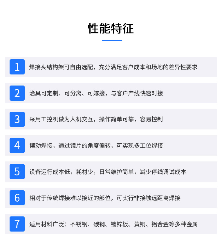 加工頭:激光頭可實現(xiàn)±60度旋轉,效率高,可實現(xiàn)產品多角度焊接,適用性強。